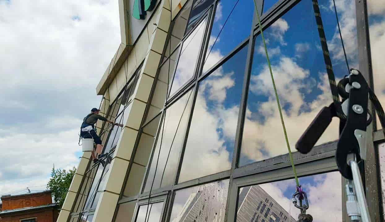 Наши альпинисты очищают отремонтированные фасады зданий и окна с Pin-Up широкого спектра современных моющих средств.